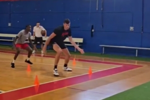 視頻中,克林根和小個球員一起進行腳步訓練,開拓者官博配文道:“??6尺vs7尺,來和大根一起練練腳步?!?/p>