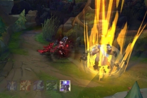回城時(shí)塞拉斯身負(fù)鎖鏈,伴隨周圍紅光落下, 劫、瑞茲、辛德拉和奧莉安娜的剪影依次浮現(xiàn),隨后塞拉斯掙脫桎梏取回冠軍獎(jiǎng)杯。