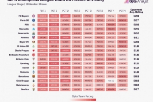Opta使用個球隊的實力排名體系進行分析(該體系將全球1.3萬支球隊納入同一評估標(biāo)準(zhǔn)進行排名,得分越高的球隊實力越強),對每支歐冠參賽隊的8個對手取平均分,算出來數(shù)值越高的證明對應(yīng)的賽程越困難, 結(jié)果1-18名的排名如下: