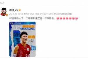 周琦更新個人微博,歡迎趙睿的到來,寫道:“村里來新人了!二年級新生歡迎一年級新生?!?/p>