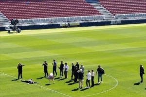 本周五,一張頗具超現(xiàn)實(shí)意味的照片在網(wǎng)絡(luò)上流傳開(kāi)來(lái)。照片中,俱樂(lè)部主席拉波爾塔仰面躺在球場(chǎng)中央的草坪上。旁邊還有幾位攝影師和一位負(fù)責(zé)俱樂(lè)部社交媒體的工作人員,這可能是為了宣傳球隊(duì)在獲得相應(yīng)區(qū)域開(kāi)放許可后重返主場(chǎng)的活動(dòng)。