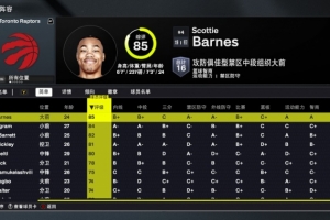 全隊有5人能力值80+,其中巴恩斯85排在第一,英格拉姆84是第二,巴雷特82、奎克利81、珀爾特爾80。