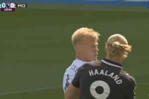 體育資訊08月31日訊 曼城vs布萊頓第9分鐘,哈蘭德單刀力量太小被沒收!隨后回頭和跟防的范赫克頂牛!