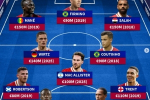 馬內(nèi)(2019年,1.5億歐)、菲爾米諾(2019年,9000萬歐)、薩拉赫(2018年,1.5億歐)