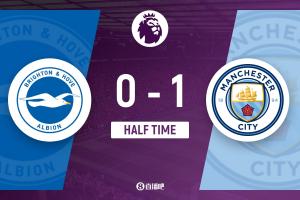 上半場傷停補時3分鐘,半場結(jié)束,曼城暫1-0布萊頓。