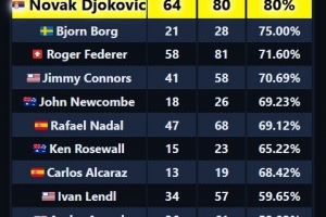 據(jù)統(tǒng)計(jì),德約科維奇80次參加大滿貫正賽,64次躋身八強(qiáng),占比達(dá)到80%。