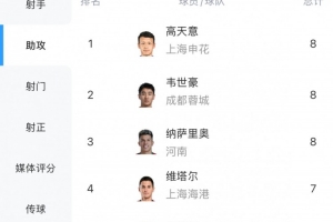 體育資訊9月1日訊 中超第23輪,蓉城球員韋世豪和河南隊(duì)球員納薩里奧分別送出助攻,兩人追平高天意,三位球員以8次助攻并列中超助攻榜榜首。
