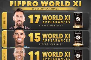 兩座大山!38歲梅西17次、40歲C羅15次入選年度最佳陣,排在前二