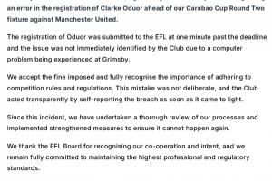 奧多的注冊在截止時(shí)間后一分鐘提交給EFL,由于格林斯比的電腦問題,俱樂部未能立即發(fā)現(xiàn)該問題。我們接受所施加的罰款,并完全認(rèn)識(shí)到遵守比賽規(guī)則和規(guī)定的重要性。這一錯(cuò)誤并非故意,俱樂部在發(fā)現(xiàn)違規(guī)后立即主動(dòng)報(bào)告。