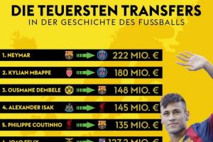 體育資訊09月04日訊 夏窗已經結束,德天空統(tǒng)計了最新的足壇歷史最貴轉會排行榜,其中,伊薩克位居第四,維爾茨位列第八,內馬爾仍居首。