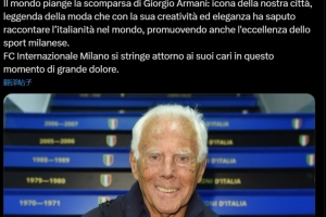 國米官方寫道:“全世界都在為喬治-阿瑪尼的離世而哀悼:他是我們城市的象征,是時尚界的傳奇人物,以其創(chuàng)意與優(yōu)雅將意大利精神傳遞到全世界,同時也推廣了米蘭城體育的卓越形象。”