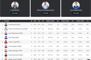 小組賽得分榜,東契奇場均32.4分傲視群雄,字母哥小組賽場均得分排名第二,命中率更是來到夸張的69.6%。