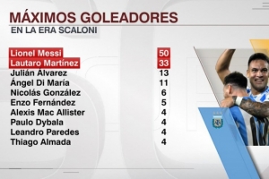 據(jù)ESPN統(tǒng)計,斯卡洛尼執(zhí)教以來,梅西打進50球阿根廷隊內(nèi)最多,勞塔羅攻入33球第二多。