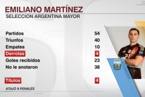 據(jù)ESPN統(tǒng)計,大馬丁為阿根廷國家隊出戰(zhàn)54場比賽,僅輸?shù)羝渲?場。