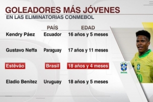南美世預(yù)賽最年輕進(jìn)球者排名: