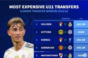 體育資訊9月5日訊 《轉(zhuǎn)會(huì)市場(chǎng)》統(tǒng)計(jì)了今夏的U21球員最貴轉(zhuǎn)會(huì)費(fèi)榜單,皇馬6250萬(wàn)簽下赫伊森居首。