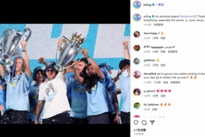 哈蘭德曬出他與埃德森三冠王賽季共同慶祝的合照,并配文:“一位絕對(duì)的傳奇人物@埃德森!謝謝你的一切,尤其是你的助攻????(你的表情符號(hào),總是如此??)”