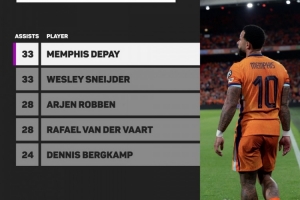 數(shù)據(jù)統(tǒng)計(jì)顯示,自1978年世界杯以來(lái),德佩是荷蘭隊(duì)助攻數(shù)并列最多的球員。