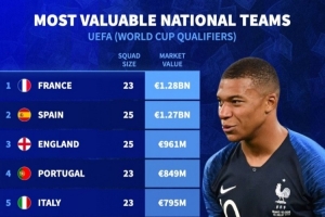 德轉(zhuǎn)列歐洲國(guó)家隊(duì)身價(jià)榜:歐元