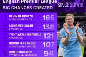 體育資訊9月7日訊 數(shù)據(jù)機(jī)構(gòu)squakwa統(tǒng)計了17-18賽季以來的英超創(chuàng)造重大機(jī)會情況,德布勞內(nèi)力壓薩拉赫居首。