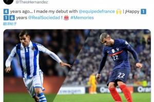 特奧社媒曬出自己身穿法國隊和皇家社會球衣的照片,配文:“4年前的今天,我在法國隊上演首秀。?;始疑鐣?16歲生日快樂!”