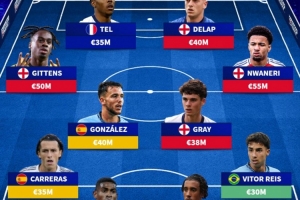中場:吉滕斯(英格蘭,5000萬)、尼科-岡薩雷斯(西班牙,4000萬)、阿奇-格雷(英格蘭,3800萬)、恩瓦內(nèi)里(英格蘭,5500萬)