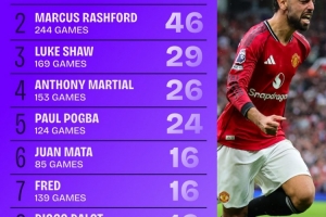 2.拉什福德 244場比賽 46次