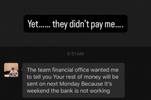 帕斯卡爾曬出兩張圖片和一段視頻,第一張圖片中的文字為“球隊希望我告訴你,你的剩余薪水會在下周一支付,因為現(xiàn)在是周末,銀行不上班?!薄叭欢麄儧]有付我錢?!迸了箍栐趫D片中寫道。