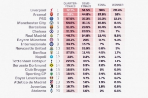 opta預(yù)測(cè)本賽季歐冠奪冠概率: