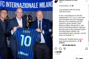 因凡蒂諾寫道:我這次的經(jīng)歷可以用“回家”來(lái)形容。非常榮幸能訪問(wèn)國(guó)米總部,并與俱樂(lè)部CEO馬洛塔、副主席兼國(guó)際足壇傳奇薩內(nèi)蒂、首席營(yíng)收官喬治-里奇以及首席參謀馬克西米里亞諾-卡塔內(nèi)塞會(huì)面。我們討論了許多重要議題,包括球員福祉、國(guó)際比賽日賽程以及足球的未來(lái)等等。參觀俱樂(lè)部榮譽(yù)室是一次深受觸動(dòng)的經(jīng)歷!