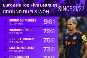 體育資訊9月11日訊 Squawka統(tǒng)計了2021-2022賽季以來球員在五大聯(lián)賽地面對抗成功的次數(shù),并列出榜單,吉馬良斯961次居首,維尼修斯、貝林厄姆二三位。