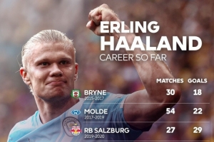 體育資訊9月11日訊 英超官方統(tǒng)計了哈蘭德職業(yè)生涯至今進球的分布,并曬出數(shù)據(jù)圖片,哈蘭德在曼城149場127球,在挪威隊45場48球。