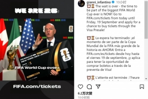 體育資訊9月11日訊 國(guó)際足聯(lián)主席因凡蒂諾更新社媒動(dòng)態(tài),宣布世界杯球票銷售即將開始。