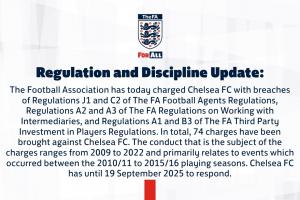 英格蘭足球總會今日對切爾西足球俱樂部提出指控,其違反《英足總足球經紀人條例》J1和C2條款、《英足總中介合作條例》A2和A3條款,以及《英足總第三方球員投資條例》A1和B3條款。切爾西俱樂部共面臨74項指控,涉及2009年至2022年期間的違規(guī)行為,主要集中于2010/11至2015/16賽季期間。切爾西俱樂部需于2025年9月19日前就此作出回應。
