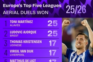 體育資訊9月12日訊 Squawka統(tǒng)計了本賽季球員在五大聯(lián)賽的爭頂成功次數(shù),并列出榜單。