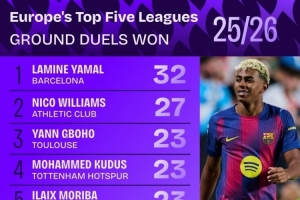 體育資訊9月12日訊 Squawka統(tǒng)計(jì)了本賽季球員在五大聯(lián)賽的地面對抗成功次數(shù),并列出榜單。