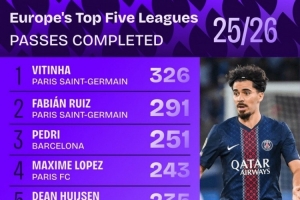 體育資訊9月12日訊 Squawka統(tǒng)計(jì)了本賽季球員在五大聯(lián)賽的成功傳球次數(shù),并列出榜單。