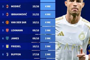 體育資訊09月12日訊 轉會市場網盤點了足壇歷史上40歲以上球員的身價排名,其中本賽季的C羅以1200萬歐元高居榜首。