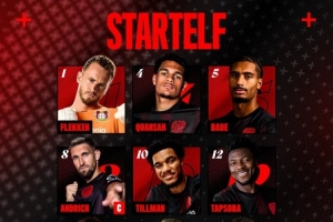 勒沃庫森首發(fā):1-弗萊肯、4-寬薩、5-巴代、8-安德里希、10-蒂爾曼、12-塔普索巴、14-??恕?0-格里馬爾多、21-巴斯克斯、23-內(nèi)森-泰拉、25-帕拉西奧斯
