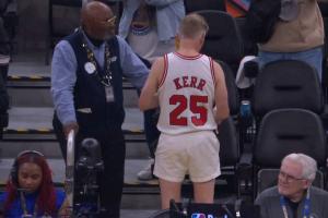 這老古董哪兒找來的啊?有球迷身穿科爾公牛球衣場邊觀賽