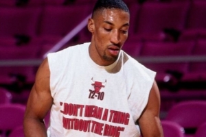 圖片中,皮蓬穿著一件紀(jì)念公牛95-96賽季常規(guī)賽取得72勝10負(fù)的運(yùn)動(dòng)衫,衣服上印著:沒有戒指的話,一切都沒有意義。