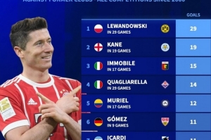 體育資訊9月14日訊 德國轉(zhuǎn)會市場統(tǒng)計(jì)了本世紀(jì)五大聯(lián)賽球員對陣?yán)蠔|家的進(jìn)球數(shù)量,并列出榜單,萊萬對陣多特打進(jìn)29球居首,凱恩對陣萊斯特城攻入19球次席。