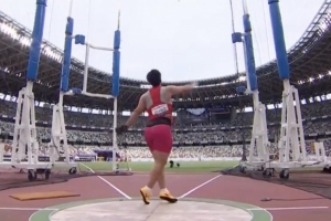 女子鏈球預(yù)賽,中國選手趙杰第一次試投就投出74米24,超過74米的晉級線,成功晉級決賽。