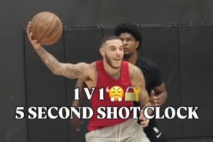 訓(xùn)練師曬騎士后衛(wèi)朗佐-鮑爾、開拓者后衛(wèi)斯庫特-亨德森,以及另一位職業(yè)球員Milan Acquaah的單挑訓(xùn)練視頻,進(jìn)攻時間限時5秒。