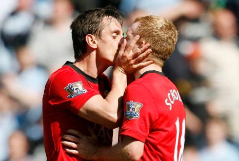 2010年4月,斯科爾斯在曼市德比最后時刻打入制勝球,幫助曼聯(lián)1-0取勝。進球后,他和內維爾在場上親吻,震驚全場。