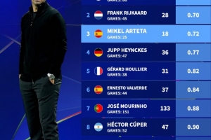 體育資訊9月17日訊 數(shù)據(jù)顯示,阿爾特塔帶阿森納參加25場歐冠僅丟18球,場均0.72丟球排在歷史第三。