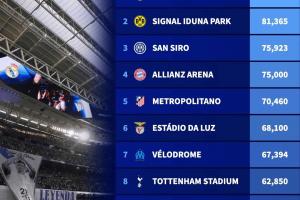 體育資訊9月18日訊 新賽季歐冠已經(jīng)重燃戰(zhàn)火,歐足聯(lián)官方盤(pán)點(diǎn)了參賽36隊(duì)10大容量最大球場(chǎng),伯納烏83186人居首。