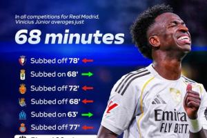 7次被換下!天空:維尼修斯至今僅3次打滿全場,場均出場68分鐘