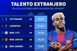 體育資訊9月18日訊 德國轉(zhuǎn)會市場統(tǒng)計(jì)了身價(jià)排名前十俱樂部的外籍球員占比,并列出榜單,在身價(jià)前十俱樂部之中,熱刺外援占比79.3%最高,巴薩43.5%最低。