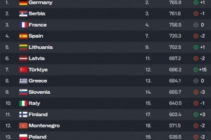 今年歐錦賽的冠亞軍排名均上升,德國男籃升至第2,力壓塞爾維亞男籃成為歐洲賽區(qū)第一,土耳其男籃狂升15位,來到第12。